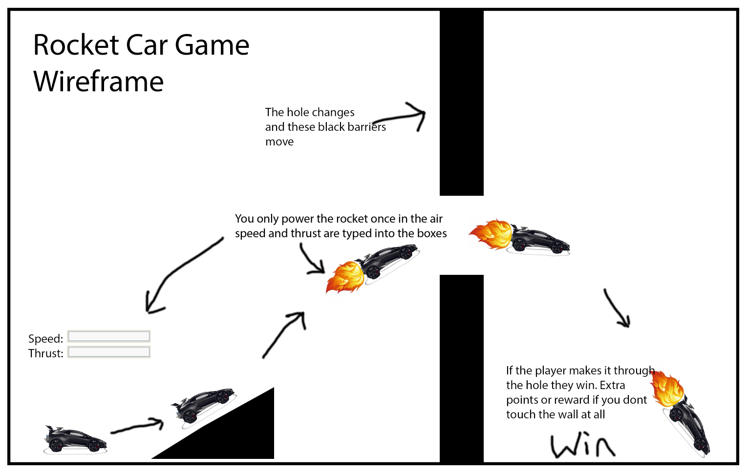 The hole dynamically changes locations in order to provide a challenge for the user to overcome. The rocket car has text based integer inputs that direct the cars power and angular momentum to attempt to shoot through the hole. As the car is flying the space button on the keyboard will be used to provide additional thrust to aid the car on its airborne path through the hole in the wall. As the game gets more difficult the options on creating more challenging levels would be a moving hole and an AI NPC that tries to stop the car mid flight from going through the hole. If the car successfully gets through the hole points are given to the player.